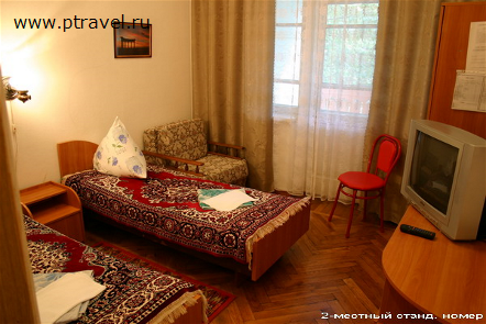 2-местный 1-комнатный "Стандарт" S=14 м2. Номер с удобствами (туалет, умывальник, душ). В номере: ТВ, холодильник, набор мебели, балкон.