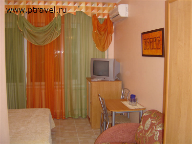4-местный 2-комнатный. Площадь номера: 42 кв.м. В номере: одна двуспальная кровать, полутороспальный раскладной диван, двуспальный раскладной диван, возможность установки дополнительного места, собственный балкон, телевизор, холодильник, сплит-система (в каждой комнате), электрическая плита, чайник, телефон, ванна, зеркало, набор полотенец, столовые принадлежности (посуда и кухонные принадлежности для готовки).