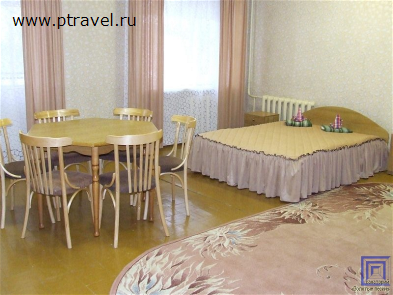 2-местный 2-комнатный "люкс" с двуспальной кроватью, шкафом, двумя тумбочками в одной комнате; диваном, столом, стульями, комодом, "горкой" для посуды, ТВ и холодильник – в другом; сантехнические услуги в номере.