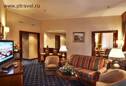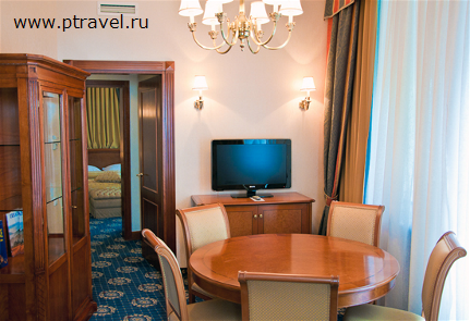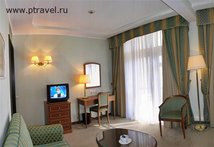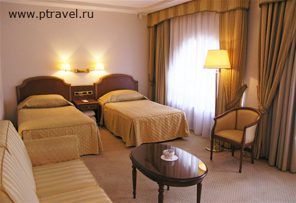 Люкс Классический. Двухкомнатный номер средней площадью 39 кв.м. с двумя санузлами. Вид на город либо парк отеля. Ширина кроватей Twin - 110 см. Каждый номер дополнительно укомплектован раскладным диваном. Есть возможность дополнительного размещения. Количество номеров – 4.