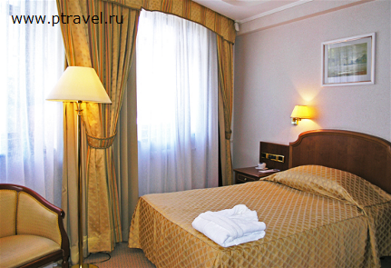 Одноместный Премьер. Однокомнатный номер средней площадью 14,5 кв.м. 5 номеров имеют балконы. Вид из окна или с балкона - парк отеля. Количество номеров – 11.