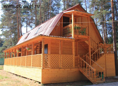 Бревенчатый двухэтажный коттедж с большим балконом вмещает до 10 человек, размещение в нём относится к уровню повышенной комфортности.