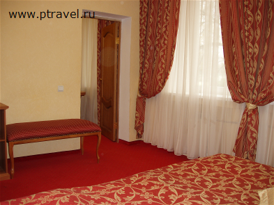 В номере: спальня с двуспальной кроватью, прикроватные тумбочки, комод, в гостиной раскладной диван, буфет с посудой, кресло или пуфик, журнальный столик, стол со встроенным мини-баром, телевизор, в прихожей гардероб и гардеробная комната, в санузле ванна, туалет, умывальник, фен, в некоторых номерах биде, в гостевом санузле туалет и умывальником. Покрытие – ковролин.