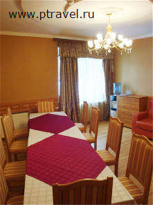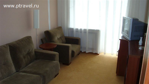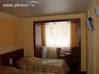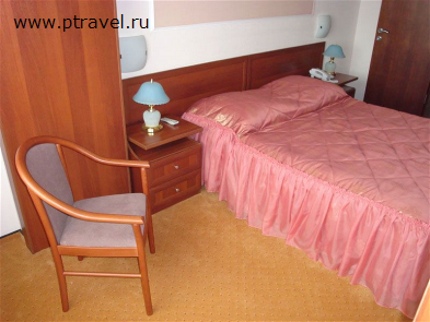 Комната: две 1,5-спальные кровати или одна 2-спальная, тумбочки, бра, коврики, туалетный столик, платяной шкаф-купе, ТВ, холодильник, внутренний телефон.