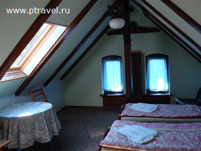 2-местный 1-комнатный мансардный. Два двухместных номера с общей ванной комнатой. В номере: две раздельные кровати, TV.